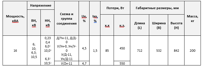 Технические характеристики трансформаторов типа ТМГ 16: